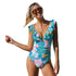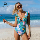 This one-piece swimsuit from CUPSHE features soft removable padded cups for maximum comfort. Made with a blend of 96% polyester and 4% spandex, it provides a perfect fit for women of all sizes. The garment can be regularly washed with ease and durability. The 100% polyester lining adds extra support and coverage. Suitable for various activities such as beaching, swimming, vacationing, surfing, and travelling, this solid-colored swimsuit is designed with a V-neck, halter, and backless style for a trendy look.