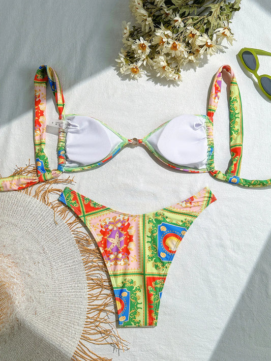Vintage Green Floral Bikini with Sexy Metal Ring