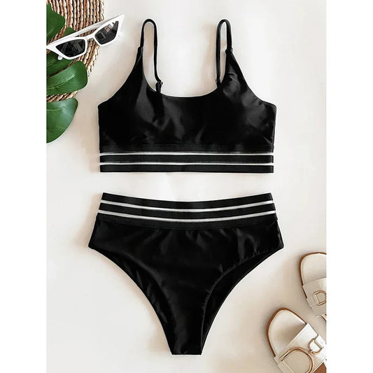 Smocked Tie Back Bandeau Mid Waist Bikini Set