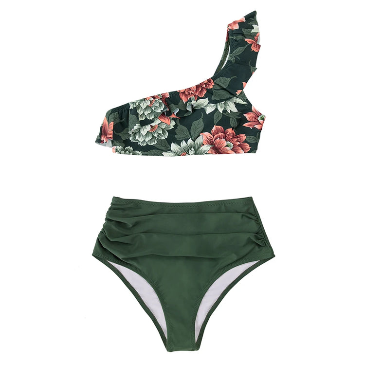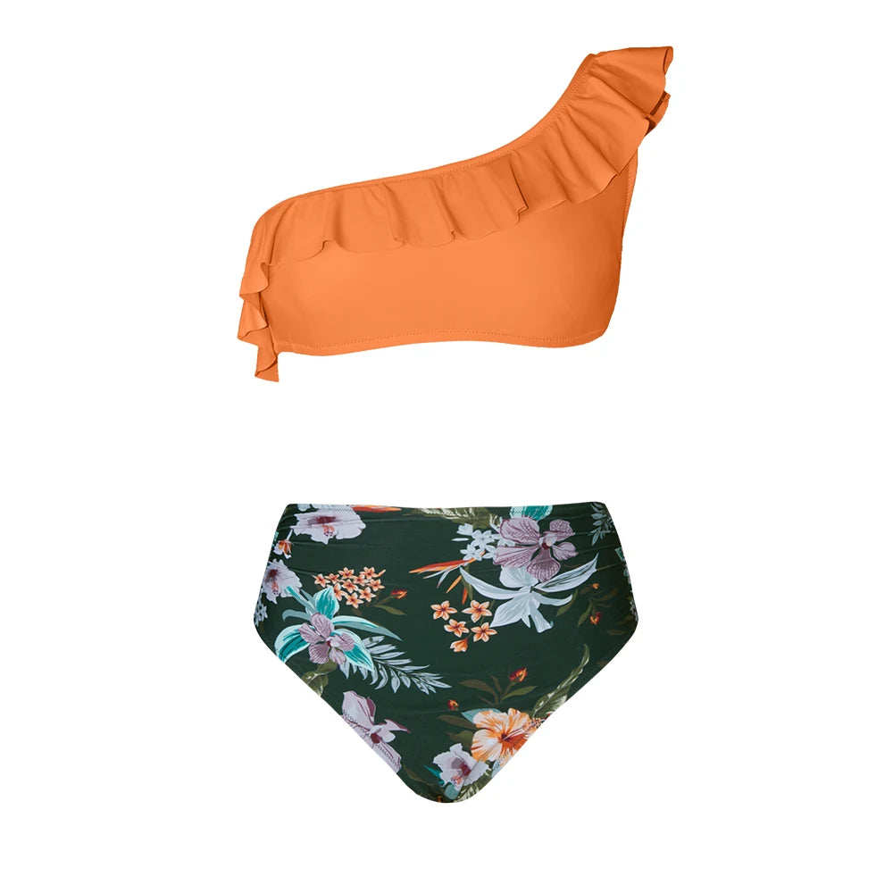 Stay chic and comfortable while enjoying your time in the sun with this elegant high-waisted bikini. Made with 80% chinlon and 20% spandex fabric, it fits perfectly and is easy to care for with regular washing. The one shoulder tank top and removable pads provide a stylish and flattering fit for any beach, pool, vacation, surfing, or traveling adventure. Designed with solid and floral patterns, this bikini is the perfect addition to your swimwear collection.