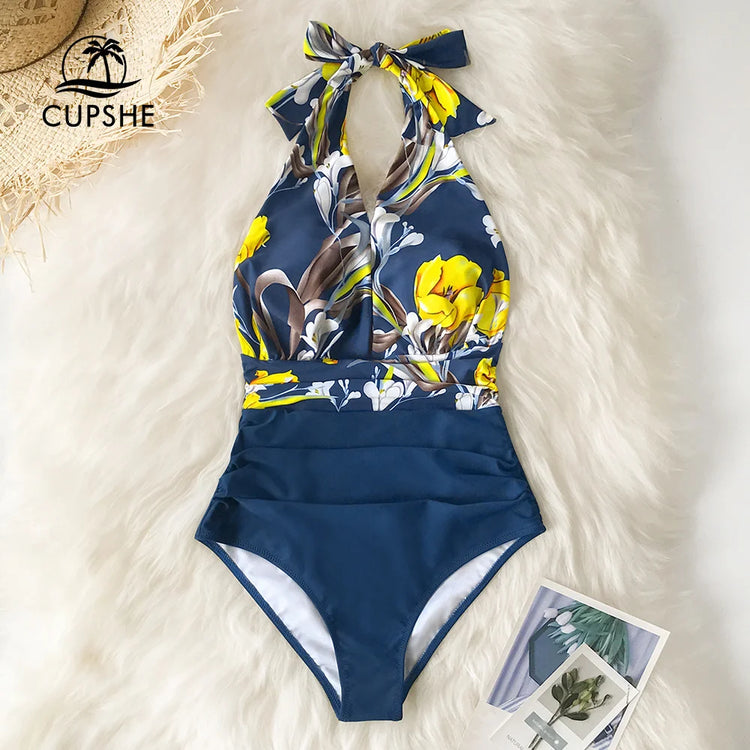 Dive into summer with the gorgeous Floral Deep V-neck Halter One-Piece Swimsuit from CUPSHE. Made with a blend of 80% chinlon and 20% spandex, it features a halter design and shirring at the front for a flattering fit. Designed for women, it's available in a variety of sizes and offers removable padded cups for added convenience. Perfect for beach days, pool parties, vacations, surfing trips, or travel, this swimsuit boasts a beautiful floral print and solid pattern that effortlessly blends style and functionality. Plus, it's easy to care for with regular washing. Get ready to make a splash with this versatile and fashion-forward swimwear option.